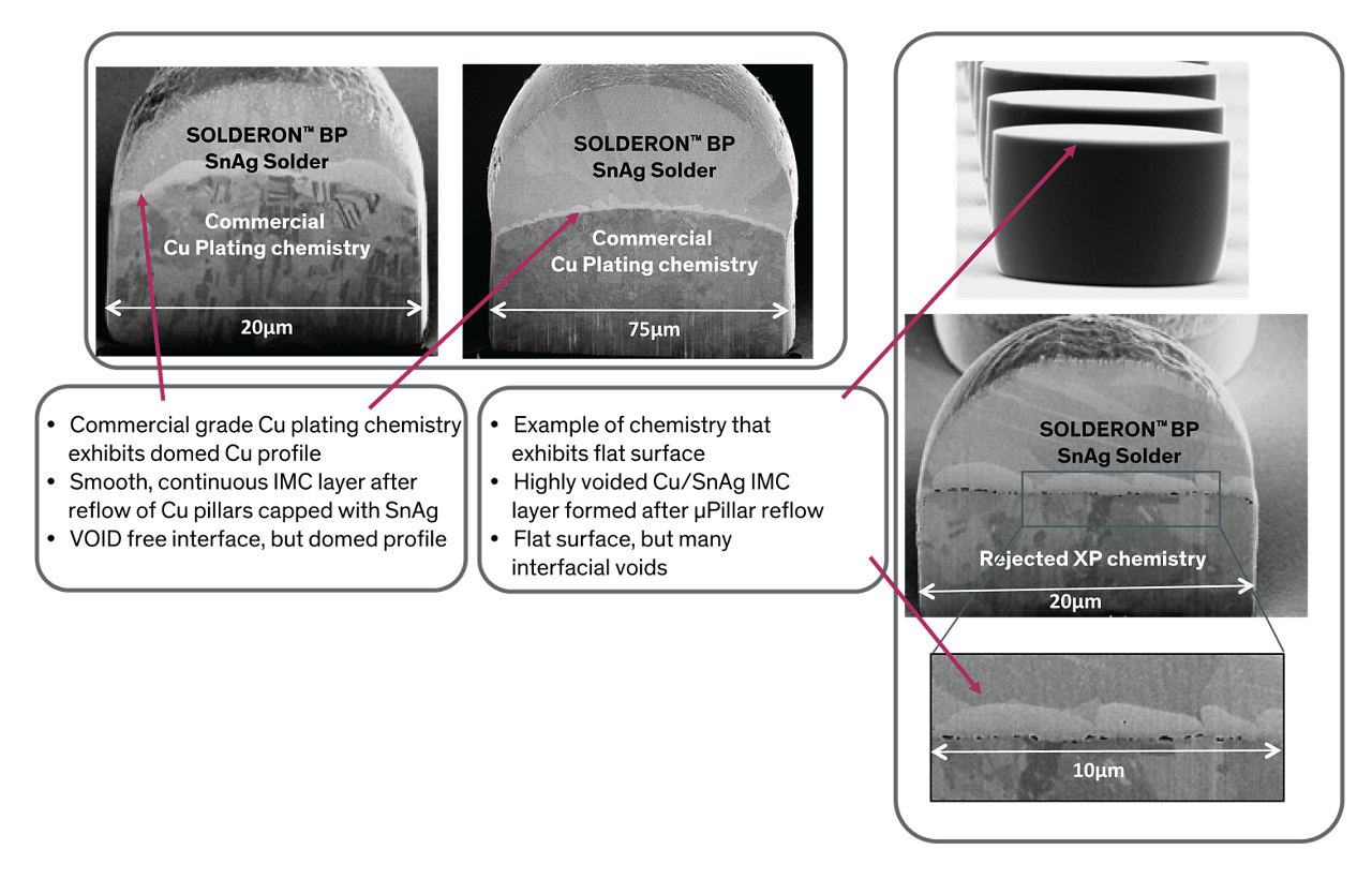 It is not difficult to achieve flat pillars with the use of additives, but unfortunately, this sometimes comes with a poor pillar-solder interface, also commonly known as intermetallic compound (IMC), that contains multiple voids. Many commercially-available plating baths that produce high-quality interfaces often create pillars that are excessively domed.