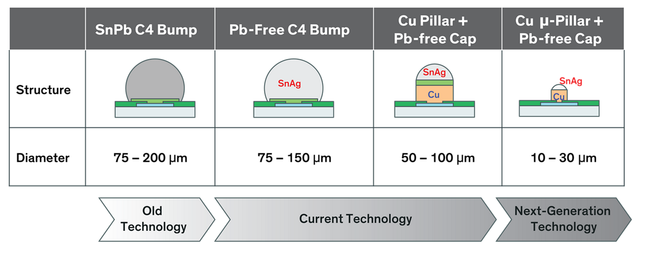 Copper pillars are now common in flip chip interconnection, usually with a lead-free SnAg solder cap on top. The transition to copper pillars has been driven by the limitations related to size and pitch (space between features) of traditional controlled collapse chip connection (C4) bumping. As pitch requirements continue to shrink, copper pillars can enable higher-density designs while maintaining sufficient bump height. The next-generation technology will feature pillars as narrow as 10 to 30 µm.