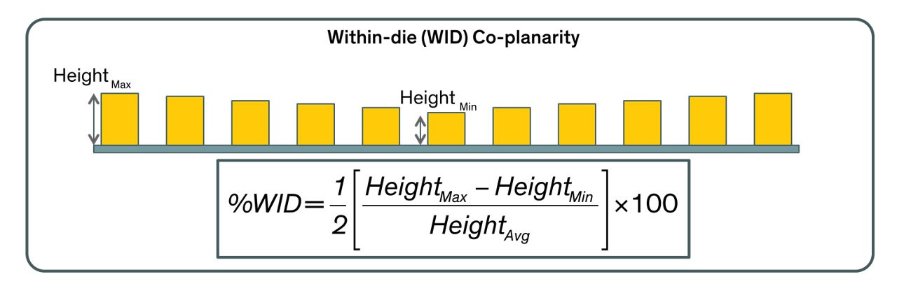 Within-die (WID) co-planarity or uniformity, calculated as shown in figure 5, should usually be less than 5%, although the target may be higher for larger pillars. A lack of WID uniformity within these parameters will cause reliability issues.