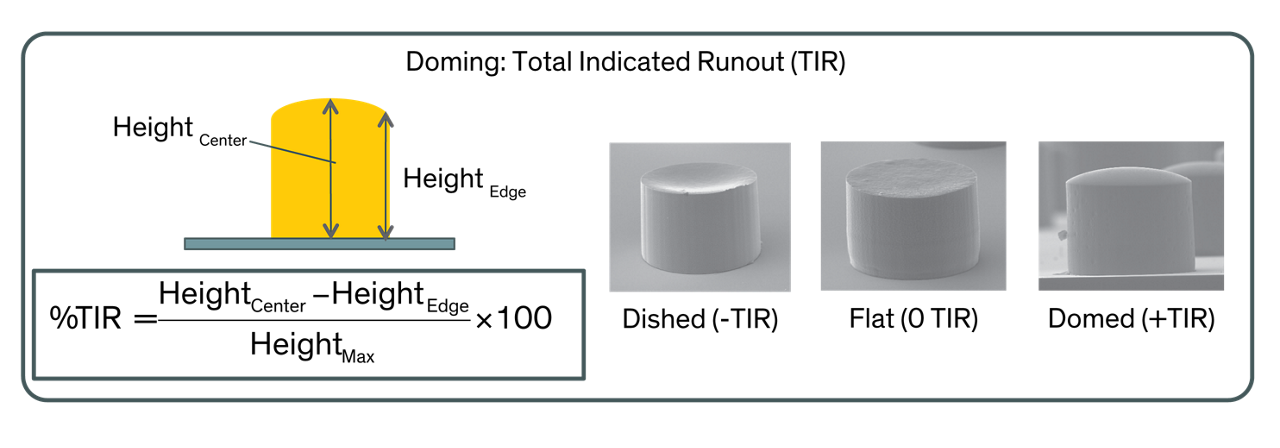 Achieving a uniform pillar shape that will be optimum for subsequent solder plating and consistent across a die presents an engineering challenge. Most customers will prefer flat pillars, though occasionally a slightly domed shape may be helpful. The best electroplating materials and processes allow engineers to tailor the profile for each application. In any case, total indicated runout (TIR) should be kept within a range of ± 5%.
