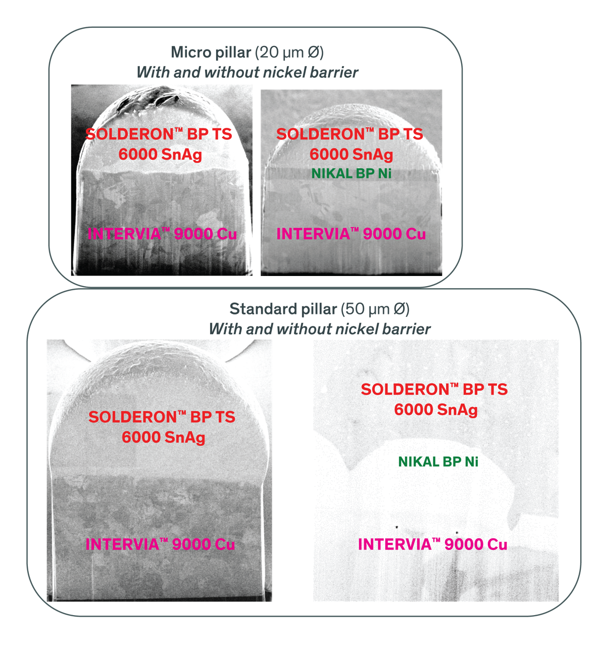 Figure 9: Void-free capped micro and standard copper pillars with and without Ni