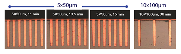 Proper selection of additives is important to create an optimum, void-free fill at high current density. The right materials enable fast filling–for example, 20 minutes for 5x50 µm vias and under an hour for 10x100 µm vias–with reliable fill from the bottom of the via up. Strong polarization at the via opening is essential to ideal filling profile.