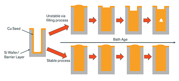 Bath stability presents another challenge to TSV electroplating. Quality may be excellent with a fresh bath, but as the organic additives break down, they can create undesirable byproducts that can result in voids in the vias.