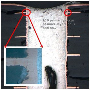 Interconnect reliability is essential to overall PCB performance, and understanding the materials, mechanical and chemical processes used to manufacture these circuit boards—is needed to ensure the best possible reliability. Since the board materials used have higher coefficients of thermal expansion (CTE) than copper, when the PCB is exposed to elevated temperatures during the assembly process, the dielectric expansion leads to an increase in the stress at the inner-layer interconnections. Therefore, good adhesion between the copper plated in the through-hole and the inner-layer copper is essential to reliable PCB function; otherwise, poor adhesion can lead to ICDs, as seen in Figure 1.