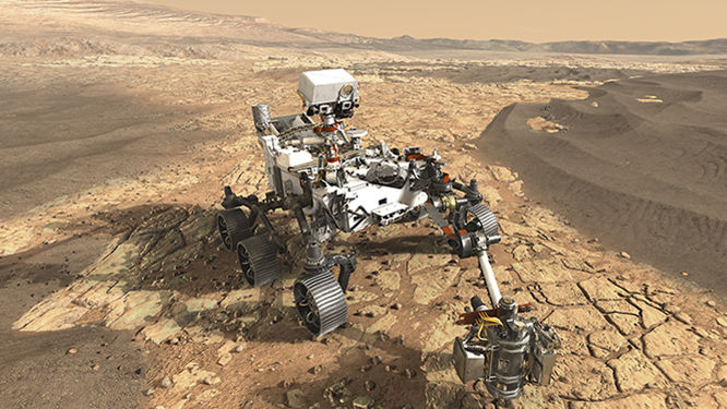 This illustration depicts NASA's Perseverance rover operating on the surface of Mars. Perseverance will land at the Red Planet's Jezero Crater a little after 3:40 p.m. EST (12:40 p.m. PST) on Feb. 18, 2021.