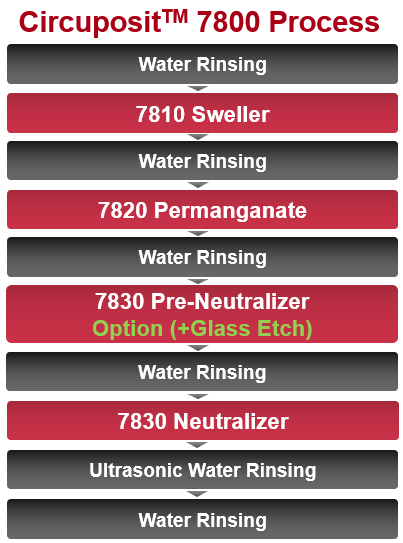 Circuposit™ 7800 Desmear process is an easy to control 3-step process, specially formulated to apply to newer generations of dielectric materials to improve the adhesion of the subsequent metal layer.