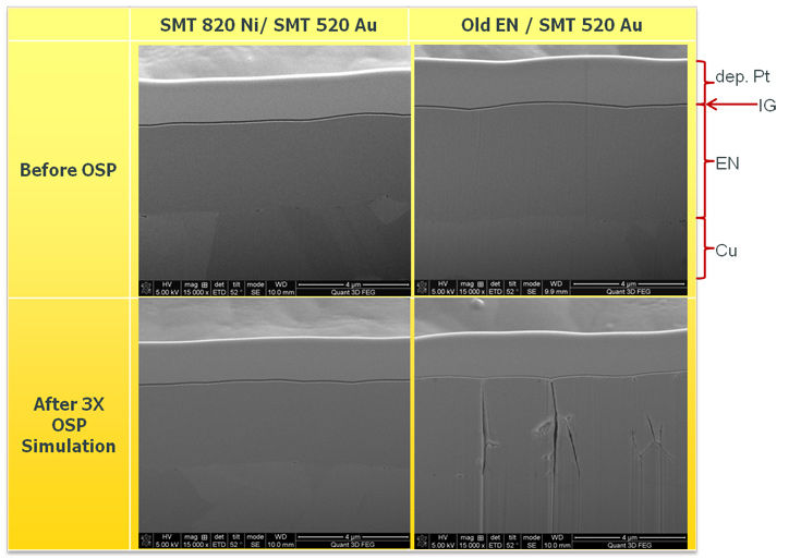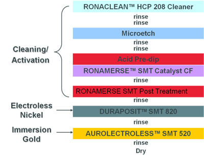 Duraposit™ SMT 820 is a high phosphorous Electroless Nickel specifically formulated for use in combination with the Aurolectroless™ SMT 520 Immersion Gold process. The phosphorous content of the electroless nickel deposit improves the corrosion resistance of the ENIG deposit, particularly for selective gold processes using OSP coatings in conjunction with ENIG, and is suitable for products that require enhanced corrosion resistance such as mobile devices, automotive, and medical applications.