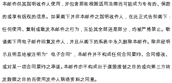 Cette communication est faite dans le but d'une utilisation par son destinataire et contient des informations qui peuvent être confidentielles ou protégées par des lois en vigueur. Si vous n'êtes pas le destinataire voulu, la présente communication vous notifie formellement qu'un usage, une copie ou une distribution de ce message électronique, dans son intégralité ou en partie, est strictement interdite. Nous vous remercions d'informer l'expéditeur dudit message par retour de courrier électronique, et d'effacer ce courrier électronique de votre système. Ce courrier électronique ne constitue ni une offre de contrat, ni un avenant à un contrat, ni une acceptation d'une offre contractuelle, sauf si l’expression « Aux fins de la conclusion d’ E-Contract » est expressément et visiblement mentionnée. Ce courrier électronique ne saurait en outre constituer un consentement à une utilisation des informations relatives à l'expéditeur pour des raisons de marketing direct ou de transfert de données à des tiers.
