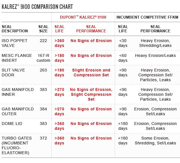 After reviewing test results, parts were produced for trials against other competitive FFKM products. Kalrez® 9100 parts outperformed the competitive FFKM products under all conditions. The Qnity and Spansion team, working together, pushed Kalrez® 9100 parts to extreme parameters faster than anyone expected and contributed to the success of this process.