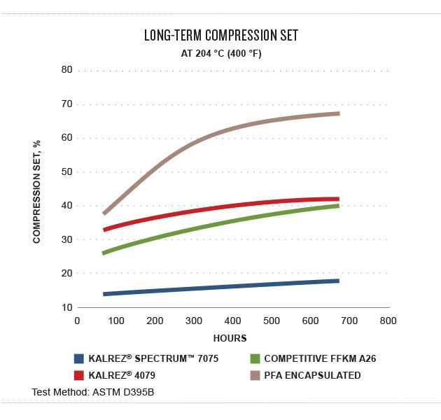 Kalrez® parts exhibit low compression set, maintaining their elastic recovery to maintain tight seals over the long haul. Because Kalrez® parts recover better under compression than other perfluoroelastomers, they maintain their shape better under prolonged stress.