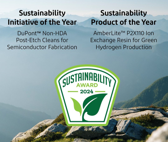 WILMINGTON, Del., Aug. 6, 2024 — DuPont (NYSE: DD) has been recognized with two 2024 Sustainability Awards from the Business Intelligence Group —Sustainability Product of the Year for the first ion exchange resin supporting the production of green hydrogen from water and Sustainability Initiative of the Year for a novel formulation supporting post-etch cleans in semiconductor production.