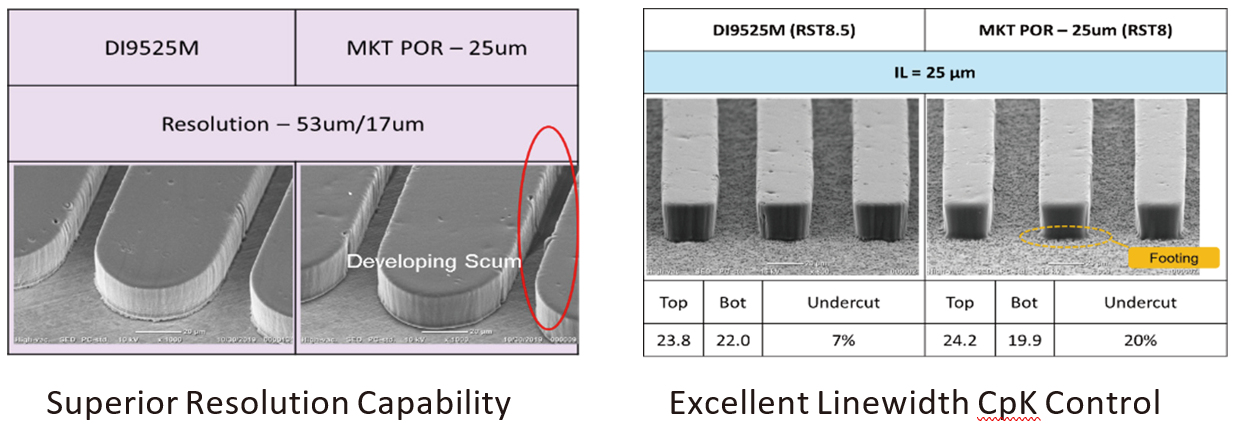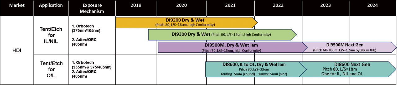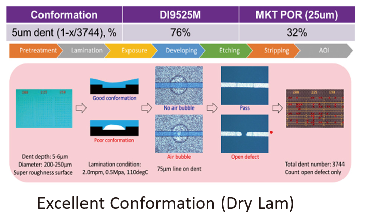 Riston® DI9000 Series & DI8600 series are multi-wavelength DI dry film photoresist designed for pitch >= 70µm tent/etch process. It enables fine patterning with excellent yield.